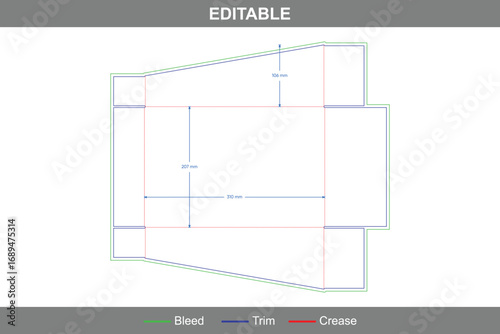 Beveled display box dieline template, custom dimensions folding carton packaging structure for retail display stands including detailed professional die line
