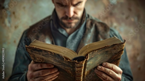 Bible Preaching. Caucasian Man Reading Old Heavy Book with Paper Background