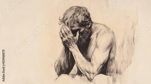 Biblical Illustration of Job Continuing His Plea - Job Sitting in the Ashes, Hands Clasped Together in a Prayer for Deliverance, His Face Showing Pain and Hope, Beige Background