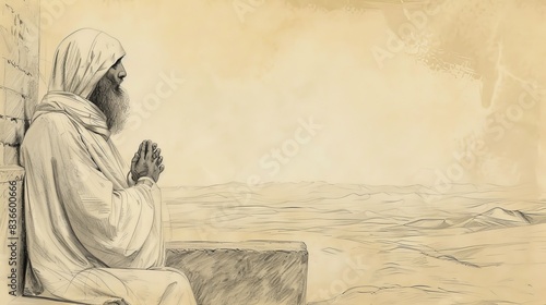Biblical Illustration of Saint Macarius of Egypt praying in a desert chapel, piety and devotion. Serene desert background, divine presence, tranquility. Beige Background, copyspace.