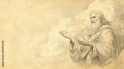 Biblical Illustration of The Lord’s Question to Job - The Lord Asking Job If He Can Control the Clouds and Natural Elements, Demonstrating Divine Authority Over Creation, Beige Background