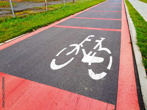 asphalt, road, signs, bicycle, bike, biking, city, cycle, horizontal, lane, painted, pathway, sport, street, symbol, traffic, way, carriageway, empty, green, highway, icon, marking, nobody, outdoors, path, regulation, restriction, separation, tarmac, warning, white, red, grass, perspective
