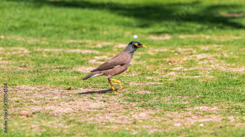 Big brown mynah walk on a grass