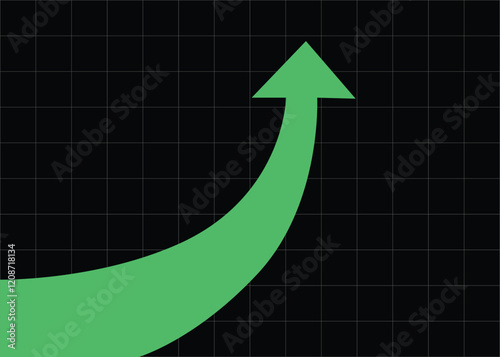 Big green curved arrow pointing up and rising up with black background and grid represents business growth and trading profits