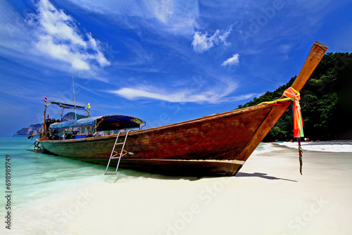 Big long tail boat parking on the white sand beach with blue sky and white clouds at Phi Phi island Krabi, Thailand.