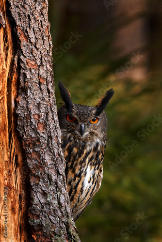 Big owl in forest habitat, sitting on old tree trunk. Eurasian Eagle Owl with big orange eyes, Germany. Bird in autumn wood, beautiful sun light between the trees. Wildlife scene from nature.