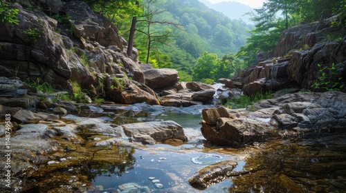 Big rocks piled up and waterlogged, very beautiful. Mountain Stone hole, rock, Yoseonam Gangwon-do, Yeongwol-gun, Korea telephoto lens realistic bright lighting