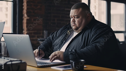 big size business man, fat man note and check on financial paper at working table.