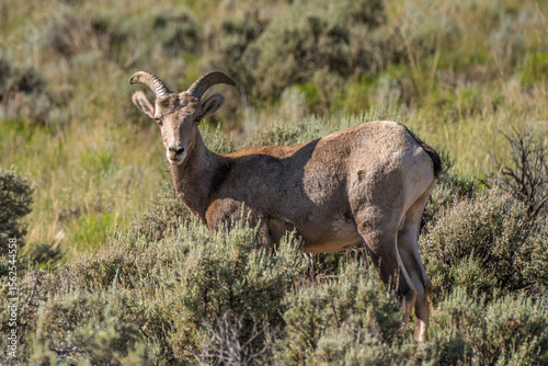 Bighorn sheep close up with large horns in New Mexico mountains in the background