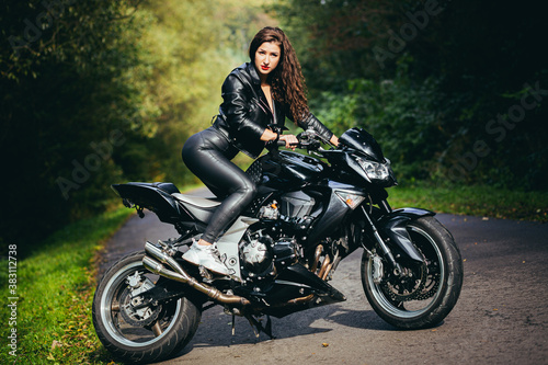 Biker sexy woman sitting on motorcycle. Outdoor lifestyle portrait