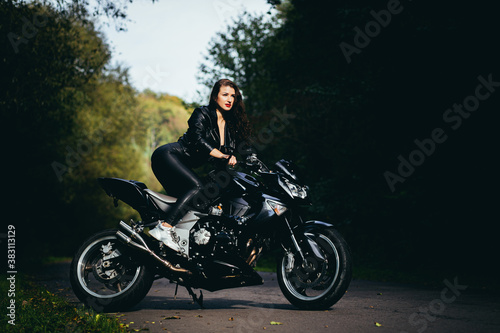 Biker sexy woman sitting on motorcycle. Outdoor lifestyle portrait