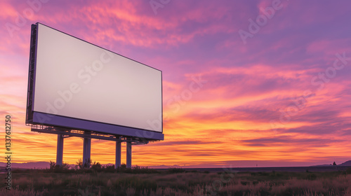 Billboard in a grassy field under a vibrant sunset. Clear, evenly lit design suitable for branding or mockups. Ideal for outdoor visuals.