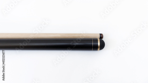 Billiard cues on a white background. Parts of a billiard cue close-up. Live photos of a billiard cue. The Art of Billiards in Motion.