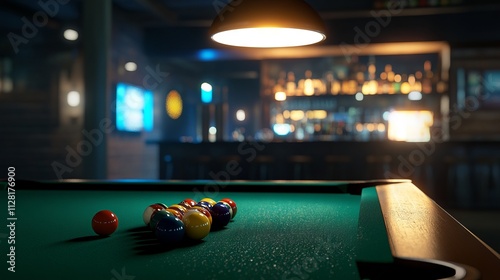 billiard table, billiard table, blurred background, front view, avocation, interior design, warm tones, pool hall, night out