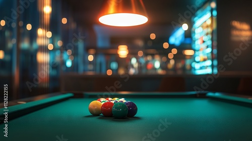 billiard table, billiard table, blurred background, front view, avocation, interior design, warm tones, pool hall, night out