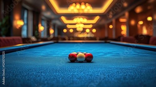 Billiards balls clustered on pool table in elegant room