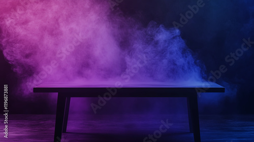 Billowing purple and crimson smoke rises from an empty table, its dynamic flow captured vividly against the deep, shadowy void.