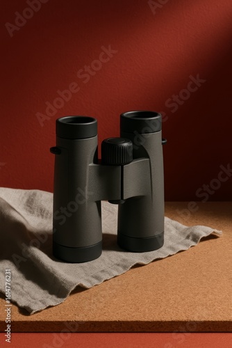 Binoculars on a cloth with red background: A close-up shot of binoculars resting on a piece of cloth, with a warm red background