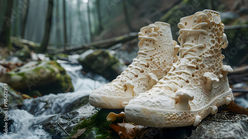 Biodegradable Footwear. Eco-Friendly Sneakers Made of Mycelium Fibers, Mimicking Mushrooms with Fungal Deco
