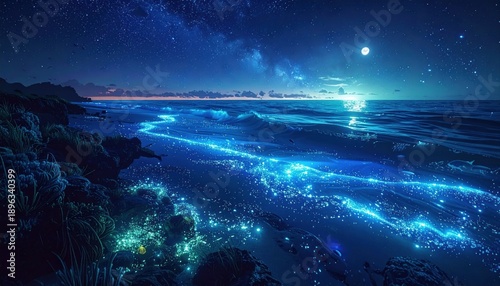 bioluminescence, ocean, sea, beach, night, star, water, wave, shore, coast, marin, nature, landscape, dark, light, glowing, sparkling, celestial, astronomy, seascape, coastal, environment, natural, scene, scenery, moonlight, moon, twilight, dusk, dawn, horizon, aquatic, plankton, tropical, paradise, vacation, travel, tour tourism, relaxation, serenity, peaceful, calm