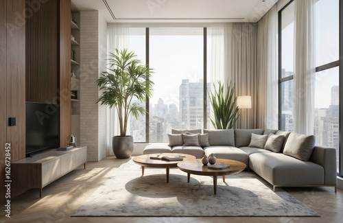 Biophilic interior design creates serene living room with natural elements. Spacious grey sectional sofa sits on textured carpet before large windows offering city views. Warm sunlight streams onto