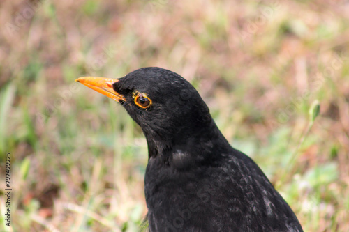 Bird Kos or bird turdus merula standing on grass lawn in its natural environment with green vegetation is search of food. Common blackbird, Merle noir (Turdus merula) or bird Kos is species of bride.