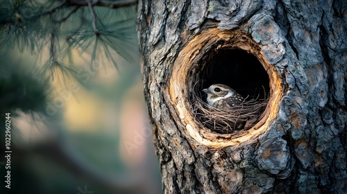bird, nest, tree, cavity, wildlife, nature, forest, timberland, birding, avian, feather, beak, eye, tree branch, foliage, green, brown, bark, habitat, sanctuary, shelter, protection, spring, summer, autumn, season, environment, wild, animal, fauna, conservation, natural
