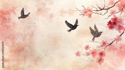 bird, cherry, blossom, spring, asian, tranquil, scene, home, decor, flower, nature, beauty, art, watercolor, painting, illustration, background, wallpaper, design, image, graphic, picture, aesthetic, delicate, peaceful, serenity, calm, gentle, soft, pastel, pink, red, tree branch, tree, sky, fly, flight, freedom, wildlife, animal