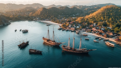 Bird's-eye view of the traditional Phinisi ships docked at the harbor of Labuan Bajo in Flores
