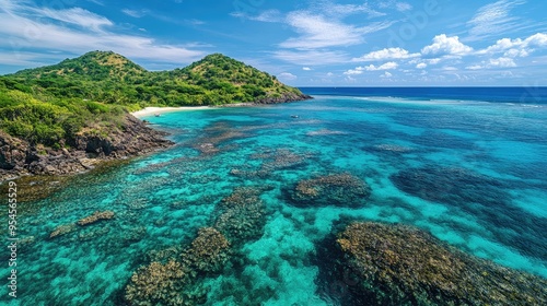 Bird's-eye view of the vibrant coral reefs and clear waters of Pigeon Island National Park, with colorful marine life