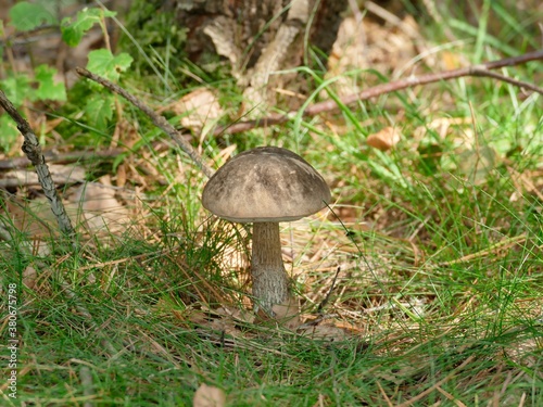 Birkenpilz, auch als Kapuzinerpilz bekannt im Sonnenschein am Waldrand