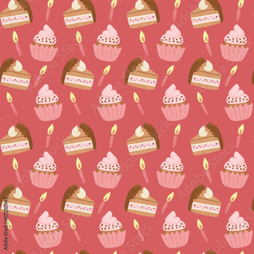 Birthday cupcakes seamless pattern. Holiday food illustration with candles and birthday cake in flat textured style and pastel colors on pink background.