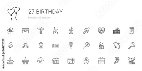 birthday, icon, set, vector, gift, card, cake, balloon, champaign, candle, lollipop, sweet, love, bird, chocolate, box, candy, bow, piece, of, confetti, gift, fireworks, illustration, symbol, isolated, signs, design, celebration, holiday, background, decoration, flat, line, graphic, black, party, element, white, happy