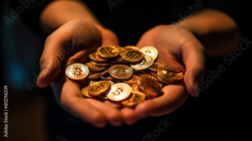 Bitcoin coins in hands. Crypto bull trend concept. Generative AI