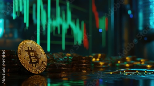 Bitcoin cryptocurrency trading concept with gold coin stack and market analysis graph. Blockchain technology investment and financial growth in digital currency.