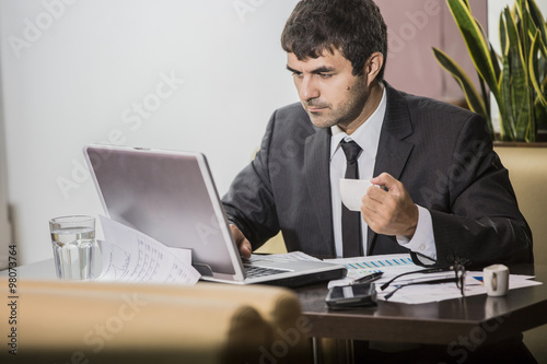 Бизнесмен сосредоточенно смотрит в ноутбук и держит в руках чашку кофе.