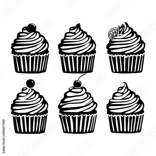cupcake, dessert, baking, illustration, black-and-white, minimalist, vintage, retro, graphic design, cake, frosting, cherry, lemon, isolated, clip art, background, design element, creative