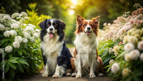 border collie, dog, summer, flower, white flower, shrub, canino, animal, pet, friendship, companionship, playful, adorable, fluffy, summer, garden, nature, landscape, white, black, miniature, selective focus, closeup, detailed, hi-res, photorealistic, realistic, amazing