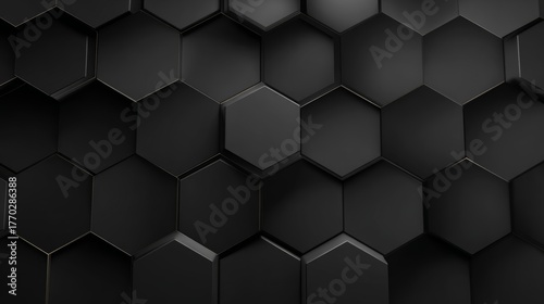 Black 3D hexagonal abstract background. Modern geometric honeycomb grid pattern. Dark texture template for technology, industry, or premium corporate presentations.
