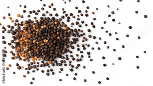 peppercorn, peppercorn, spice, black pepper, food, cooking, ingredient, culinary, receipe, photo, texture, background, white background, overhead, scattered, isolated, grain, seed, brown, black, dark, light, contrast, food photography, studio shot, vector, illustration, design, element, commercial, editorial, website, blog, cardboard box, marketing, copy space
