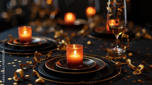 new year's eve, dining table, black, gold, elegant, glassware, centrepiece, decor, celebration, party, luxury, festive, holiday, dinner, silverware, table setting, candle, champaign, sparkling, luxurious, fine dining