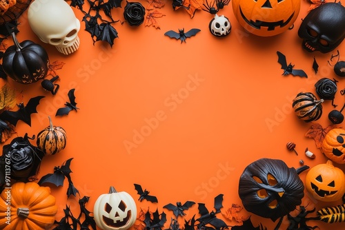 Black and orange Halloween decoration on orange background. Invitation card template with empty space. Happy Halloween!