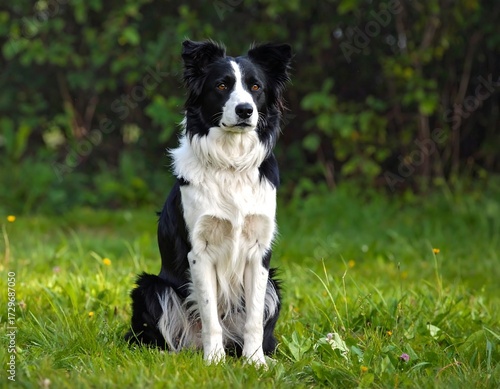 dog, border, collie, black, white, sitting, grass, field, outdoors, nature, portrait, animal, pet, cute, calm, watchful, intelligent, loyal, faithful, friendly, obedient, active, playful, happy, healthy, strong, standing, focused, sharp, serious