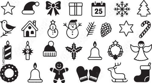 christmas, holiday, star, snowman, tree, angel, chaplet, bell, candle, calendar, snowflake, bow, gift, mitten, reindeer, stocking, bird, house, pine cone, holly, candy cane, festive, decoration, winter, december, outline, symbol, christmas design