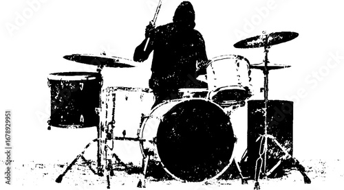 drum, black, white, stencil, illustration, music, kit, set, design, vignetting, ink, urban, grunge, silhouette, spray, spatter, distress, vintage, grimy, tribal, collection, art, musician, rhythmic, percussion, cymbal, stick, artistic, pattern, graphic, monochrome, hobby, drumming, shadow, noise, equipment, jam, concert, cultural, creativity, texture, expressive, unique, spraypaint