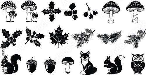 Black and White Forest Icons Vector Set: Fox, Squirrel, Owl, Mushroom, Holly, Maple Leaf, and Acorn Silhouettes for Autumn, Nature, and Animal Design Projects.