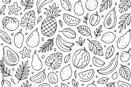 Black and white fruit pattern with leaves and tropical elements. Vector doodle illustration