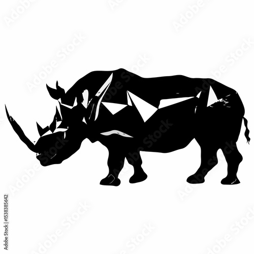 Black and White Geometric Rhino: A Low Poly Art Illustration of Abstract, Angular Wildlife in Minimalist Silhouette Style