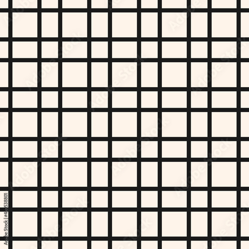 Black and white grid, square, geometric seamless pattern. Checkered vector background. Vertical and horizontal lines drawn crossing stripes. Simple minimal background. Pattern design for wallpaper.