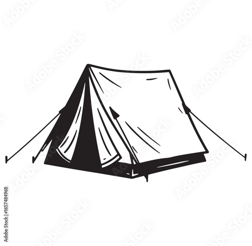Black and white hand drawn illustration of a classic camping tent for outdoor adventure